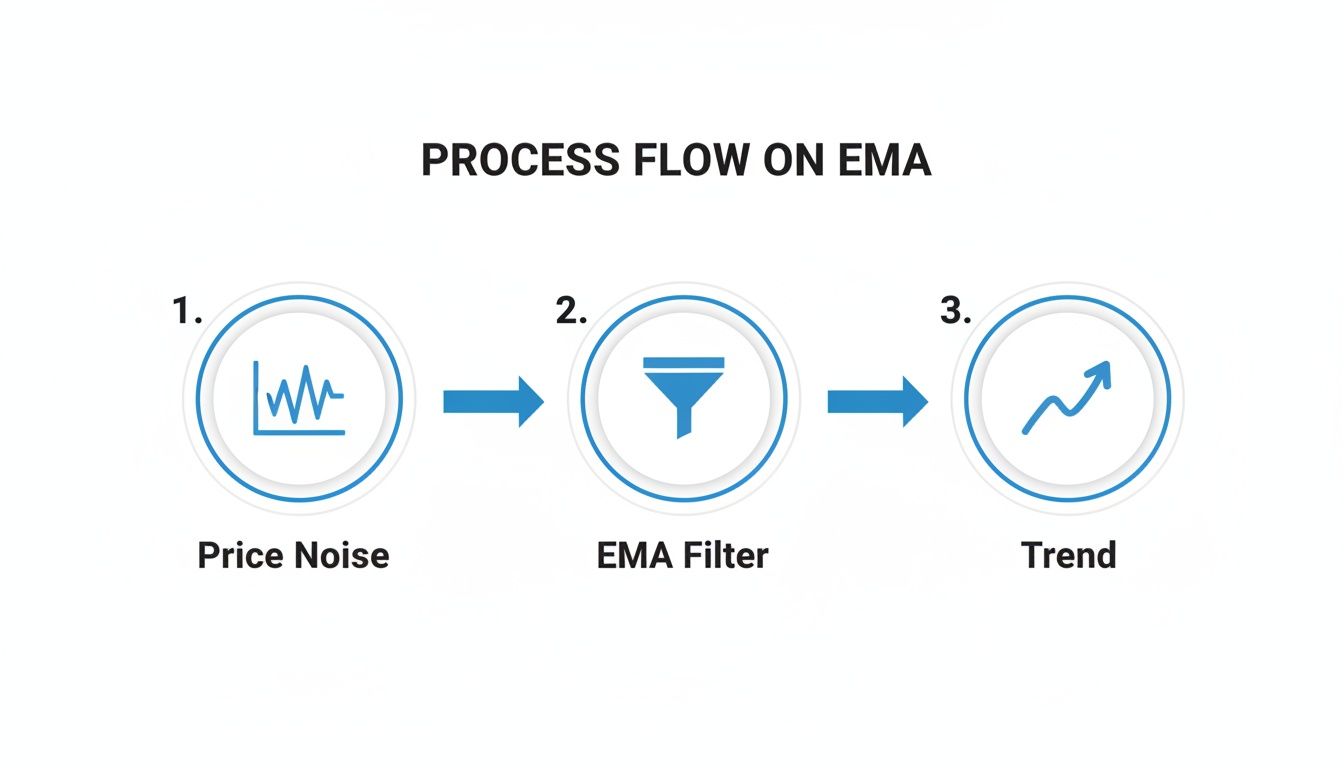 To really get a feel for the exponential moving average, you need to look under the hood. While you'll never have to do the math by hand when trading, understanding how it's calculated gives you a powerful intuition for why the EMA behaves the way it does. It's the difference between blindly following a signal and truly understanding the story the chart is telling you.