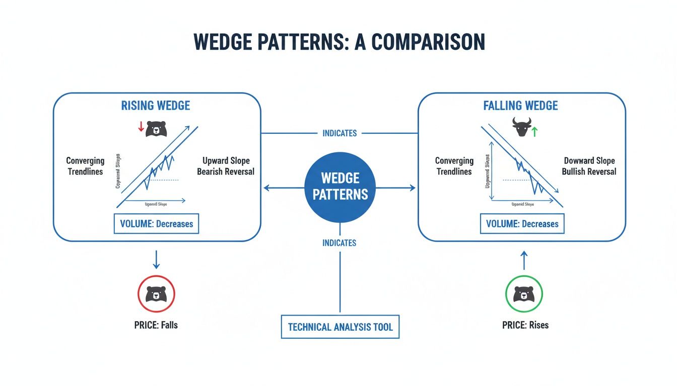 While they might look like cousins, rising and falling wedges are more like polar opposites. Both patterns show price getting squeezed between two converging trendlines, but they tell completely different stories about what’s happening under the market’s hood.