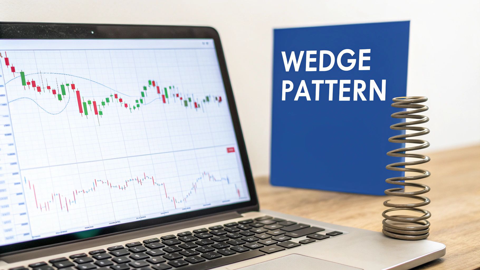 Think of a stock wedge pattern as the market taking a deep breath. It's like a coiled spring, where the battle between buyers and sellers reaches a temporary stalemate. You'll see the price action get squeezed between two converging trendlines, signaling that a big, explosive move is just around the corner.