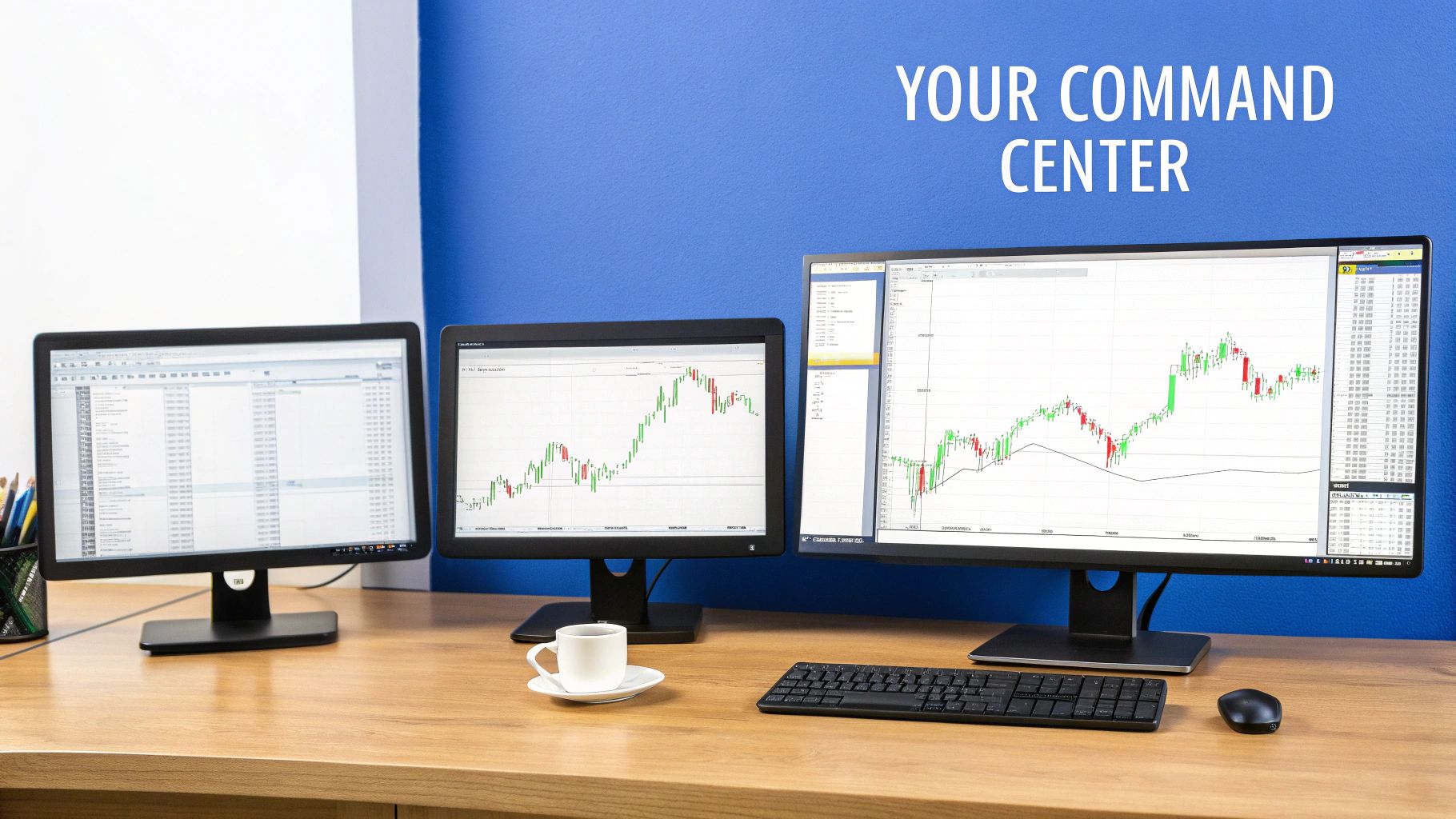 An effective command center is more than just software; it includes your physical setup, too. Most professional day traders use multi-monitor configurations to keep their charts, news feeds, and order execution windows all in view at once.