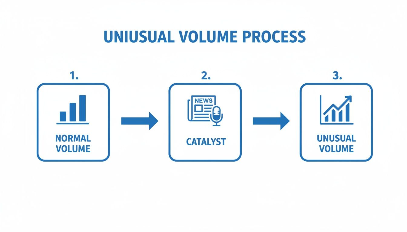 This flow chart nails the process. A stock is just trading normally, then some catalyst hits, and boom—unusual volume floods in.