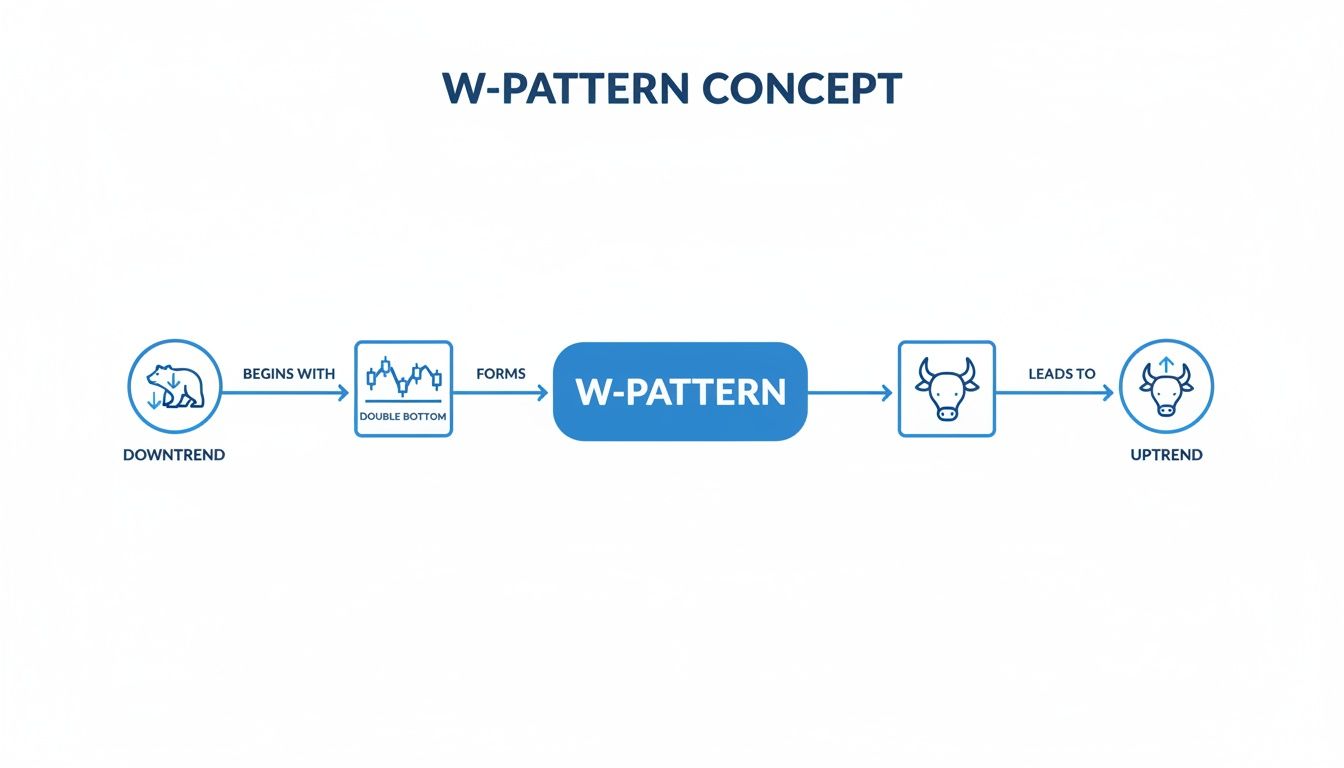 A real W pattern doesn't happen all at once. It unfolds in a few key stages, each one telling you something important about what's going on under the surface:
